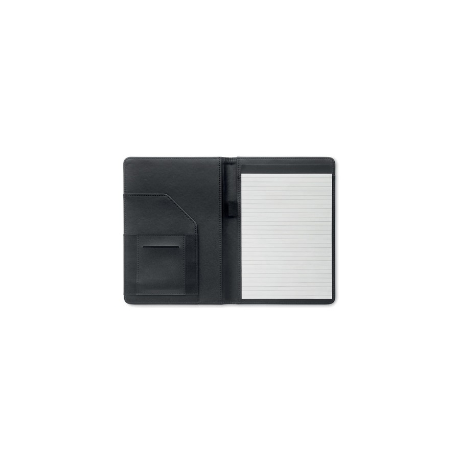 Conférencier A5 en 300D RPET 2 tons. Bloc-notes A5 remplaçable. 40 pages blanches lignées en papier bambou (20 feuilles). Porte-stylo. Porte-cartes à l'intérieur et un grand compartiment.