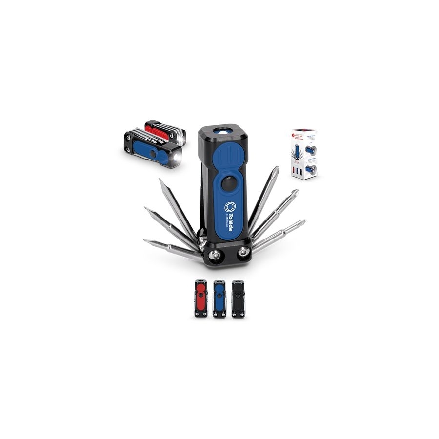 Dans la voiture, en rando, en vacances... Vous ne ferez plus un pas sans ce super-bricolo nomade qui rend de précieux services ! Kit outil multifonctions avec 6 tournevis (3 dimensions de tournevis plat SL3, SL4, SL5) et 3 dimensions de tournevis cruciforme PH0, PH1, PH2). Avec double torche LED : 1 LED (30 lumens) + 1 LED pour l'éclairage de la zone de travail. Fonctionne avec 3 piles LR44 fournies. Livré en boite individuelle illustrée. Marquage en 1 couleur. Matières : ABS